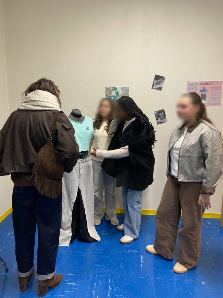 La scénographie, conçue intégralement à partir de matériaux de récupération (cartons, éléments d’anciennes expositions, papiers usagés, etc.), s’inscrivait dans la même cohérence écologique. Les mannequins de présentation, prêtés par des familles et des membres de l’équipe éducative, ont permis de mettre en valeur les vêtements dans une mise en scène claire et lisible.