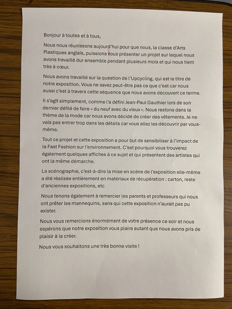 Ce jeudi 15 janvier, les élèves de 3ᵉ du dispositif APAng (Arts plastiques en anglais) ont présenté leur exposition Upcycling lors d’un vernissage qu’iels avaient organisé.
