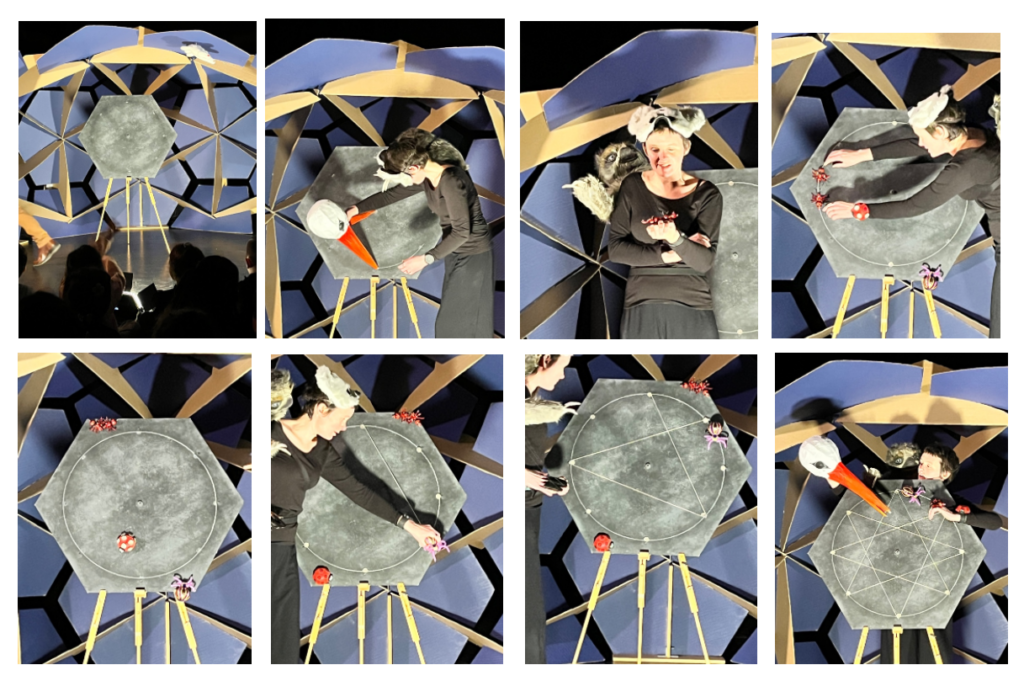 À l’issue du spectacle, les enfants ont pu poser leur questions aux intervenants : « Comment fonctionne le flexagone ? » « Quelle est la forme du décors derrière toi ? » « Comment s’appelle le gros tambour ?» « Est-ce que faire des spectacles est ton métier ? » « Comment peut-on fabriquer nous-mêmes un flexagone ?»